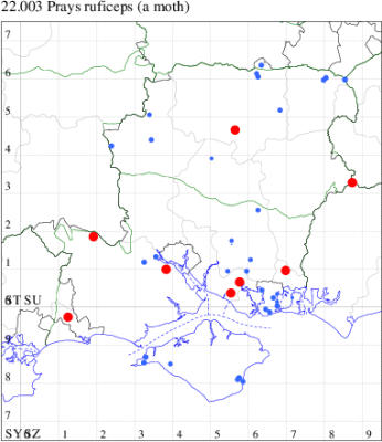 Wingspan 14-17 mm. Originally thought a dark form of Prays fraxinella , DNA bar coding has indicated that P. ruficeps is a species distinct in its own right. P.fraxinella does have a dark form but in it the faint "fraxinella" markings of the normal, black and white form can still be distinguished. Prays ruficeps is uniformly dark brown/blackish with an orangey red head. Old records of the so-called f. rustica of fraxinella could refer to either, so its historic status is unknowable. The larva feeds on Ash.
