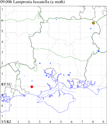 Nationally scarce (Nb) in woodland and heaths in three discontinuous areas: southern England, north-western England and near Aviemore. In Hampshire known from a few sites across the county, and possibly under-recorded, but not recorded on the Isle of Wight to date. Wingspan 14-18 mm. More frequently recorded in the larval stage, when the galls are fairly easy to find where they are present; the imago can be separated from other Lampronia species by their relatively plain appearance. Larva feeds within branches of Birch, forming galls.