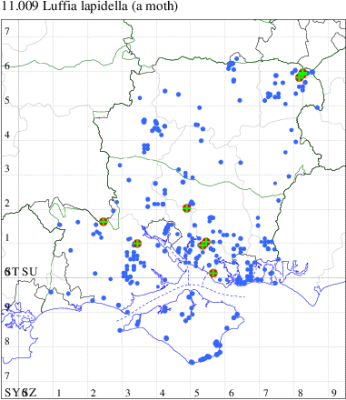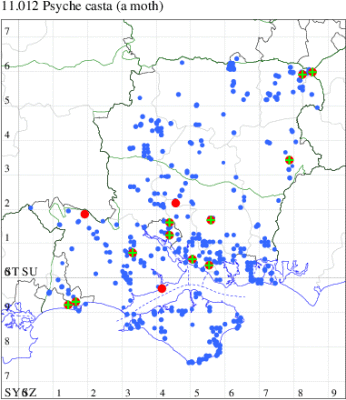 VC11: Hale Purlieu, NF, one, 21 Jun (JPuz); Matley Wood, NF, case, one, field observation, occupied larval case. , 28 May (THib); Shamrock Quay, Southampton, case, six, field observation, 21 Sep (JOug); Swaythling, Southampton, case, three, field observation, 11 Jun (MEdg); Allbrook, one, 07 Jun (SIng); Warsash Common, case, three, field observation, 04 Mar; Stubbington, case, six, field observation, 16 Jun; case, one, field observation, case and larva inside trap. , 08 Sep (DPH); Bishop's Waltham, case, two, field observation, 22 Mar (JOug); Tuckton, Bournemouth, case, three, field observation, 18 Jul (SRW); Purewell Meadows BoC, larva, one, field observation, 07 Jun (RPH det. MJW); Needs Ore NNR, two, 16 Jun (CNB);