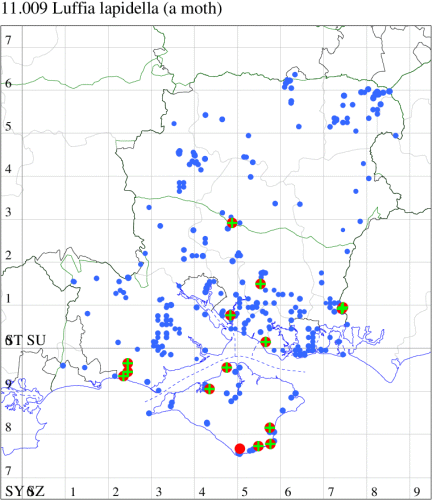 VC11: Hamble-le-Rice, case, one, field obs., 19 Feb (CBarr); Lee-on-Solent, case, one, field obs., 03 May (IHrg); Bishop's Waltham, case, present, field obs., 22 Apr (JOug); Southleigh Forest, larva, one, field obs., on oak, 21 May; larva, one, field obs., on oak, 19 Jun (MGT); Barton on Sea, larva, one, field obs., 12 Apr; Old Milton, larva, three, field obs., 26 Jan; New Milton, larva, one, field obs., 02 Apr (SKee);