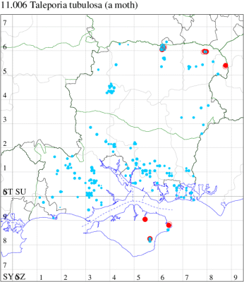 VC10: America Wood, case, two, field observation, old cases, apparently parasitised, 06 Apr; case, three, field observation, larval case found in three new locations, 11 May; case, one, field observation, 18 May; Sandpit Copse*, case, one, field observation, 20 May (IOu); Bembridge, case, one, field observation, 19 Sep (PBa);