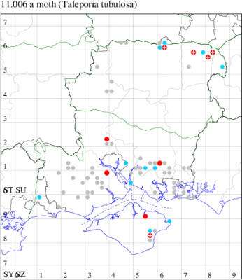 Local in woodland and rough meadows throughout much of the British Isles. In Hampshire cases can be found in woodland, on rocks and old walls, and are widespread and common on the mainland, although there are no recent record from the Isle of Wight. Wingspan male 15-20 mm, female wingless. The adult moths are seen occasionally, but most records are of larval cases. Larva feeds on various lichens, dead insects and decaying vegetable matter, living within a movable case, over-wintering once or twice. The case is constructed of silk coated with lichen, fine sand and bark, and can be found.