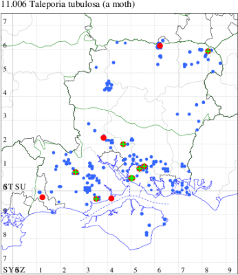 VC11: Emery Down, NF, case, one, field observation, vacant larval case affixed to a fence. , 11 Apr (JHam); Romsey, one, 11 Jun (NRJ); Warsash, case, one, field observation, 09 Feb (AMD); Bishopstoke, case, four, field observation, 31 Jul (DSH); Warsash Common, case, one, on tree trunk, on beech trunk. , 04 Mar (DPH); Botley Wood, case, four, field observation, 07 Jan (AMD); case, five, on tree trunk, ''Numerous'' cases on beech trunk(s)., Tapnage., 19 Apr (DWal); Hurn, one, 08 Jun; one, 15 Jun; two, 16 Jun (MJef); South Baddesley, larva, one, field observation, 24 Jun (PBar); Needs Ore NNR*, one, 10 Jun (CNB);