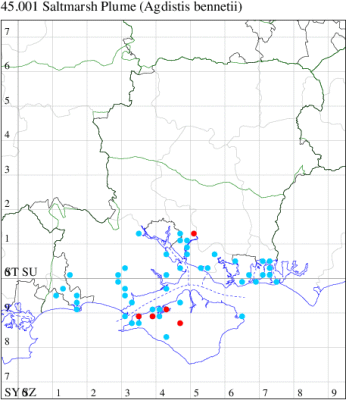 Local in saltmarshes throughout much of southern and eastern England, where exclusively coastal. In Hampshire and on the Isle of Wight locally abundant in saltmarshes along the southern coast of the county and northern coast of the Island. Wingspan 24-30 mm. Like the other Agdistis species, the fore- and hind-wings are not divided and the wings are held forward with front of body raised on long forelegs. Resembles A. meridionalis but darker and more coarsely speckled. Larva feeds on Common Sea-lavender.