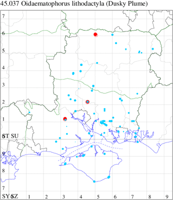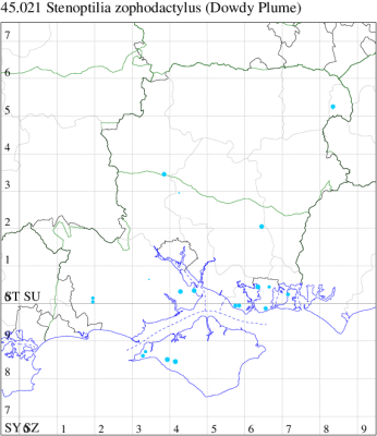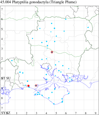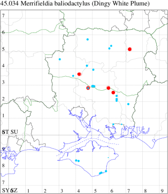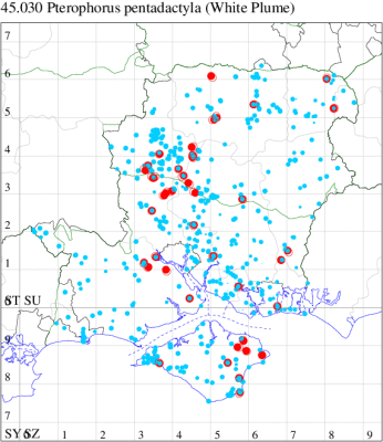 Nationally scarce (Nb) on chalk downland and waste ground, mainly in the southern counties of England. In Hampshire restricted to the few areas of unimproved grassland at sites such as Oxenbourne, Stockbridge and Magdalen Hill Down. Recently recorded on the Isle of Wight for the first time since 1981. Wingspan 20-27 mm. Very similar to several other species of plume moth, from which separable only by dissection of the genitalia. Larva feeds on stems of Wild Marjoram.
