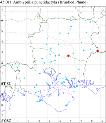 Local in woodland, heaths and river-banks throughout much of the British Isles. In Hampshire and on the Isle of Wight widespread, but generally less common than A. acanthadactyla. Wingspan 18-23 mm. Confusable with A. acanthadactyla. A. punctidactyla has a greyish or, when fresh, dark greenish tinge, whereas A. acanthadactyla is reddish; also, A. punctidactyla has a lot of speckling on the basal half of the forewings, A. acanthadactyla has very little. Larva feeds on flowers and seeds of Hedge Woundwort, Common Restharrow, Spiny Restharrow and Meadow Crane's-bill.