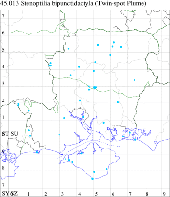 Local on sea cliffs, dry grassland and sand-dunes throughout much of England. In Hampshire and on the Isle of Wight has been recorded in the past from all three vice-counties, but there are no recent records from north Hampshire, and the species is probably under-recorded in the south and on the Island. Wingspan 16-23 mm. Larva feeds on flowers and seeds of Centaury, Yellow-wort and Gentian.
