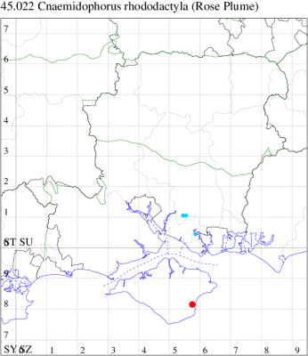 Nationally scarce (Na) in hedgerows and woodland in parts of south-eastern England. In Hampshire known only from Botley Wood, where it was first seen in 1977, with a probable immigrant individual being the first on the Isle of Wight in 2020. Wingspan 18-26 mm. A fairly distinctive plume moth. Larva feeds on buds, flowers and leaves of Wild Rose, Dog-rose and Cultivated Rose.