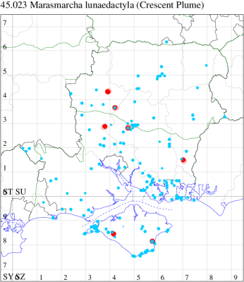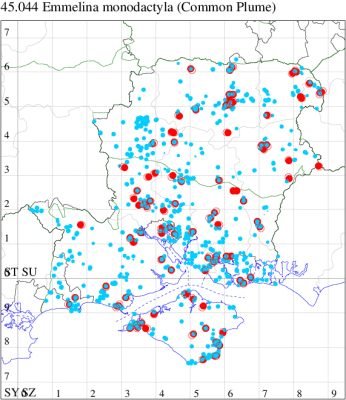 For the maps, all records prior to 2020 are shown by a blue dot (the larger the dot, the more recent), with the current year's records shown in red. As previous records are superimposed on any report for 2020, new sites have greater emphasis (i.e. will show as 'more red').