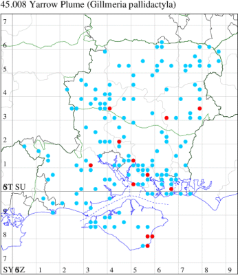 Nationally scarce (Nb) in flower meadows and gardens in parts of England and Wales. In Hampshire the foodplant is very local and so, therefore is the moth, which is known only from the Portsmouth area, where it is common amongst the foodplant. Not recorded from the Isle of Wight to date. Wingspan 24-28 mm. Similar to G. pallidactyla but the third pair of legs in the latter is largely one colour, in the present species it is banded brown and white below the middle spur, and the forewing is more distinctly marked. Gillmeria ochrodactyla flies around tansy (Tanacetum vulgare), and therefore also on ruderal grasslands. G. pallidactyla lives on yarrow (Achillea).