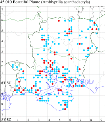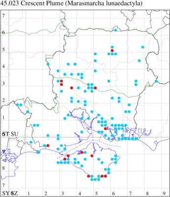 For the maps, all records prior to 2021 are shown by a blue dot (the larger the dot, the more recent), with the current year's records shown in red. As previous records are superimposed on any report for 2021, new sites have greater emphasis (i.e. will show as 'more red').