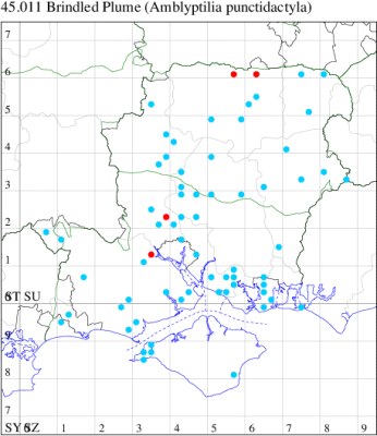 Local in woodland, heaths and river-banks throughout much of the British Isles. In Hampshire and on the Isle of Wight widespread, but generally less common than A. acanthadactyla. Wingspan 18-23 mm. Confusable with A. acanthadactyla. A. punctidactyla has a greyish or, when fresh, dark greenish tinge, whereas A. acanthadactyla is reddish; also, A. punctidactyla has a lot of speckling on the basal half of the forewings, A. acanthadactyla has very little. Larva feeds on flowers and seeds of Hedge Woundwort, Common Restharrow, Spiny Restharrow and Meadow Crane's-bill.