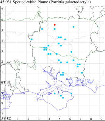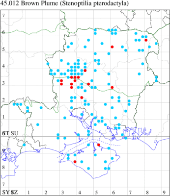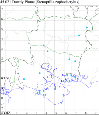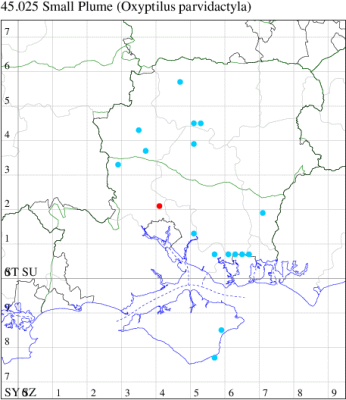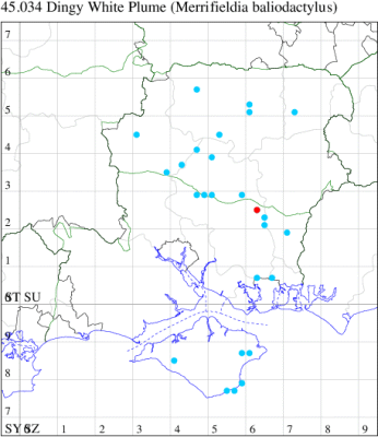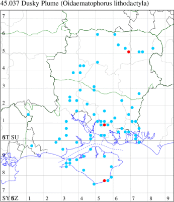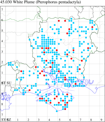 Nationally scarce (Nb) on chalk downland and waste ground, mainly in the southern counties of England. In Hampshire restricted to the few areas of unimproved grassland at sites such as Oxenbourne, Stockbridge and Magdalen Hill Down. Recently recorded on the Isle of Wight for the first time since 1981. Wingspan 20-27 mm. Very similar to several other species of plume moth, from which separable only by dissection of the genitalia. Larva feeds on stems of Wild Marjoram.