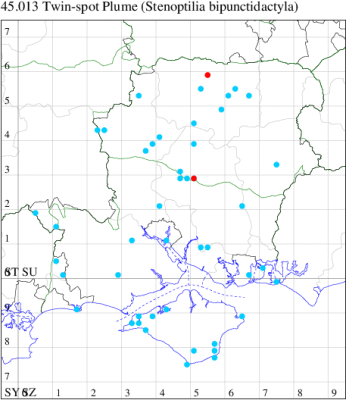 Local on sea cliffs, dry grassland and sand-dunes throughout much of England. In Hampshire and on the Isle of Wight has been recorded in the past from all three vice-counties, but there are no recent records from north Hampshire, and the species is probably under-recorded in the south and on the Island. Wingspan 16-23 mm. Larva feeds on flowers and seeds of Centaury, Yellow-wort and Gentian.