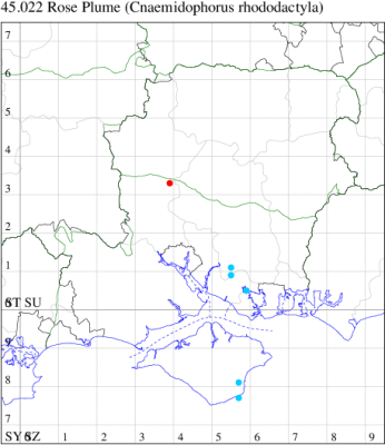 Nationally scarce (Na) in hedgerows and woodland in parts of south-eastern England. In Hampshire known only from Botley Wood, where it was first seen in 1977, with a probable immigrant individual being the first on the Isle of Wight in 2020. Wingspan 18-26 mm. A fairly distinctive plume moth. Larva feeds on buds, flowers and leaves of Wild Rose, Dog-rose and Cultivated Rose.