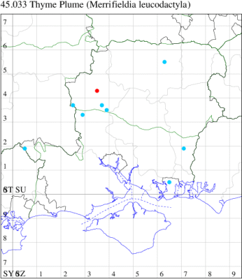Local on chalk downland, sea cliffs and sandhills throughout the British Isles. In Hampshire recorded on the downs in small numbers, barely annually. Not recorded reliably on the Isle of Wight to date. Wingspan 18-25 mm. Thoroughly confused in the past with M. tridactyla from which separated only by microscopic examination of the antennae. Larva feeds on Wild Thyme.