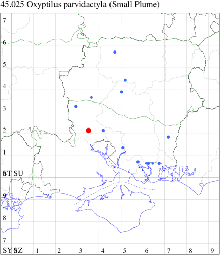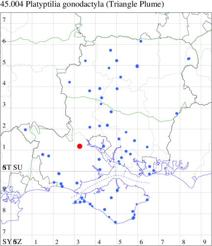 Nationally scarce (Nb) on chalk downland and waste ground, mainly in the southern counties of England. In Hampshire restricted to the few areas of unimproved grassland at sites such as Oxenbourne, Stockbridge and Magdalen Hill Down. Recently recorded on the Isle of Wight for the first time since 1981. Wingspan 20-27 mm. Very similar to several other species of plume moth, from which separable only by dissection of the genitalia. Larva feeds on stems of Wild Marjoram.