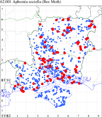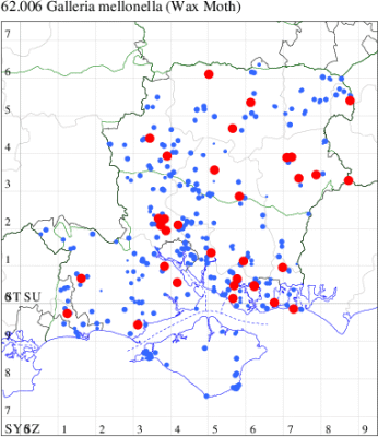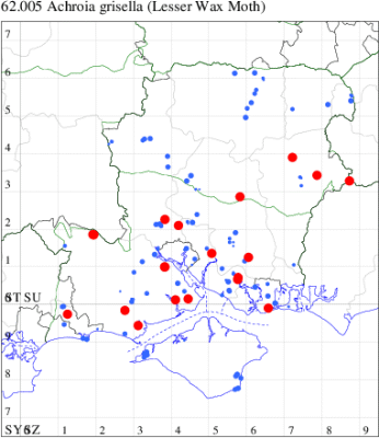 Common around beehives throughout England and Ireland. Widespread in Hampshire and on the Isle of Wight. Wingspan 30-41 mm. Larva constructs, and feeds within, galleries in honeycombs.