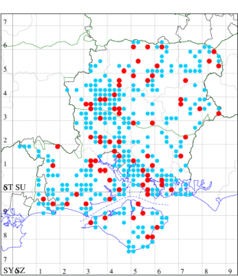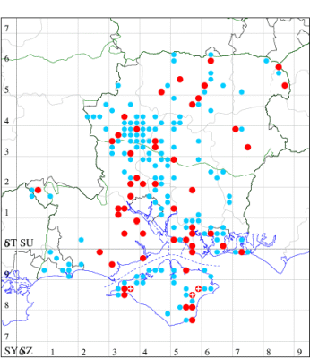 For the maps, all records prior to 2022 are shown by a blue dot (the larger the dot, the more recent), with the current year's records shown in red. As previous records are superimposed on any report for 2022, new sites have greater emphasis (i.e. will show as 'more red').