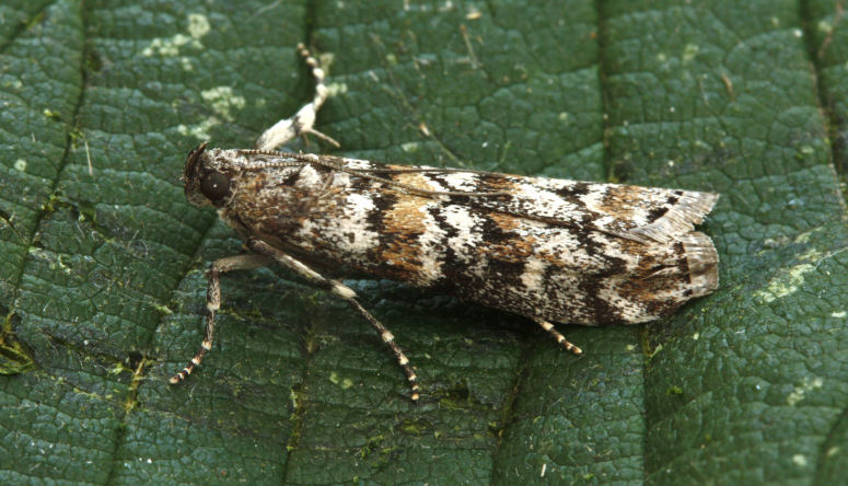 Common in woodland and hedgerows throughout much of southern England. in Hampshire and on the Isle of Wight, widespread throughout, although seldom more than a few individuals are recorded from any locality. Wingspan 23-28 mm. The irregular transverse banding of ochreous and black on forewing makes this an easy species to identify [Goater]. Larva feeds within bark of Ash, eventually killing the tree if present in sufficient numbers.