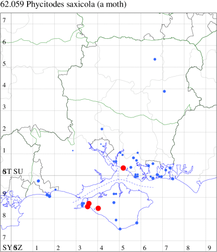 Local in rough meadows and waste ground throughout much of England, especially in the south-east, and also in the Scottish Highlands. In Hampshire and on the Isle of Wight under-recorded and confusable with the other Phycitodes species, and has been bred on several occasions from the heads of Common Ragwort, from both coastal and inland localities - despite its specific name, it is not tied to the coast. Wingspan 18-22 mm. This species is intermediate in size between P. binaevella and P. saxicola, is shorter-winged than the former and more robust than the latter; its spot pattern resembles that of P. saxicola, though the slightly different positioning of the two discal dots does seem to be fairly constant [Goater]. Larva feeds within flowerheads of Yarrow, Tansy, Groundsel and Common Ragwort.