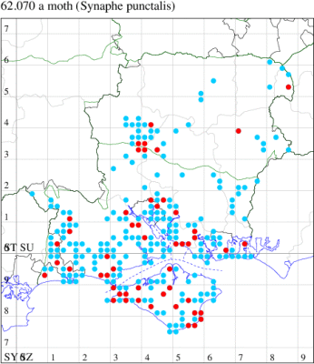 Local on shingle beaches, sand-dunes, chalky ground and dry open areas in parts of southern England, predominantly coastal. In Hampshire and on the Isle of Wight common to very common on the coast, occasional inland where it has evidently decreased since the 1970s. Wingspan 22-27 mm. Long-legged, like Dolicharthria punctalis but that has a white discal spot, and second line is much more irregular and less conspicuous [Goater]. Larva feeds on various mosses, often on the ground.
