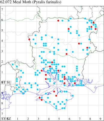 Common in farm buildings, barns, warehouses and granaries, also sometimes in houses, across much of Britain, occasionally recorded in the wider countryside. Distributed widely and evenly over Hampshire and on the Isle of Wight, with no particular pattern. Wingspan 22-30 mm. Nocturnal, but often easy to find on walls during the day. Main confusion species are P. lienigialis, which is much darker and lacks contrastingly pale median area, and Painted Meal Moth P. pictalis, which has straighter fasciae on forewing. Larva feeds on dried goods, cereals, grain and dry vegetable matter.