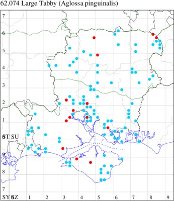 VC11: Woodlands, NF, present, 12 Jul (RBW); Totton, one, 07 Sep (LHan); Lee, nr Nursling, one, field observation, 10 Jul (CTha); Stanbrige Earls, one, indoors, 24 Jun (JRM); Bitterne, Southampton, one, field observation, 12 Jul (PAB); Allbrook, one, 13 Jul (SIng); Fareham, one, to light, 11 Aug (KJW); Pennington, one, 19 Jul; one, 27 Jul (RFC);