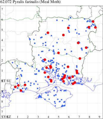 Common in farm buildings, barns, warehouses and granaries, also sometimes in houses, across much of Britain, occasionally recorded in the wider countryside. Distributed widely and evenly over Hampshire and on the Isle of Wight, with no particular pattern. Wingspan 22-30 mm. Nocturnal, but often easy to find on walls during the day. Main confusion species are P. lienigialis, which is much darker and lacks contrastingly pale median area, and Painted Meal Moth P. pictalis, which has straighter fasciae on forewing. Larva feeds on dried goods, cereals, grain and dry vegetable matter.