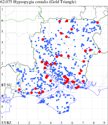 For the maps, all records prior to 2023 are shown by a blue dot (the larger the dot, the more recent), with the current year's records shown in red. As previous records are superimposed on any report for 2023, new sites have greater emphasis (i.e. will show as 'more red').