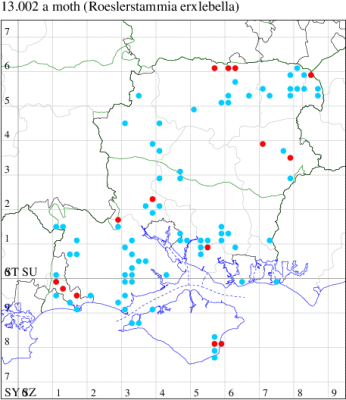 VC11: Romsey, one, 14 Aug (NRJ); Botley Wood, one, 19 Apr (KJW det. RJD); Merritown Heath, present, 28 May (DFoo); Hurn, one, 06 Aug; one, 16 Aug (MJef); Burton, nr Christchurch, one, 06 Jul (JStw);