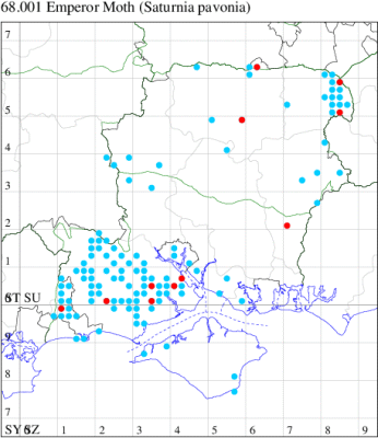 VC12: Basingstoke, one, to pheromone lure, timed at 1740hrs, 24 Apr; one, to pheromone lure, timed at 1615hrs, 25 Apr (GAH); Silchester Common, seven, to pheromone lure, 7 came quite quickly to the EMP lure, 24 Apr (GJD); Yateley Common, larva, one, field observation, 12 Jul (BDal); Caesar's Camp, Aldershot, 10, to pheromone lure, males came to lure within 2 minutes, 27 Apr (GJD)