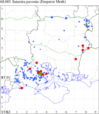 VC11: Withybed Bottom, NF, one, field observation, 05 May (ENes); Denny Wood, NF, four, field observation, 03 May (PDB); Shatterford, NF, larva, present, field observation, 19 Aug (Unkn.); Beaulieu Road Station, one, to pheromone lure, 24 Apr; Beaulieu Road Station, NF, one, to pheromone lure, 24 Apr (TDCh); Shatterford, NF, six, field observation, 17 May (NBur); Furzy Brow, NF, larva, present, field observation, 22 Aug (TGib); Yew Tree Heath, NF, larva, one, field observation, 13 Jul (NAdd); Longdown, NF, three, to pheromone lure, 09 May; North Gate, NF, one, to pheromone lure, 14 May; one, to pheromone lure, 27 May (TDCh); Paultons Park, Romsey, present, field observation, 04 May (iNat); Dibden Purlieu, NF, three, to pheromone lure, attracted to unmated female. , 20 Apr (RAC); Butser Hill, one, field observation, 07 May (NBur); Hengistbury Head, one, 11 May (HengistH);