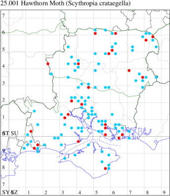 For the maps, all records prior to 2021 are shown by a blue dot (the larger the dot, the more recent), with the current year's records shown in red. As previous records are superimposed on any report for 2021, new sites have greater emphasis (i.e. will show as 'more red').