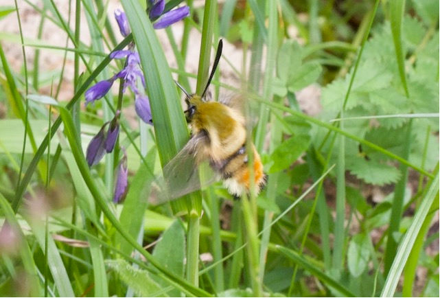 Nationally scarce (Nb) along woodland margins and on heathland in England and Wales. In Hampshire and on the Isle of Wight, has recovered from a low level in the 1970s; the species is reported occasionally, with the main population occurring in the New Forest. Wingspan 46-52 mm. The most likely confusion species is Narrow-bordered Bee Hawk H. tityus, which see for differences. Larva feeds on Honeysuckle, over-wintering as a pupa.