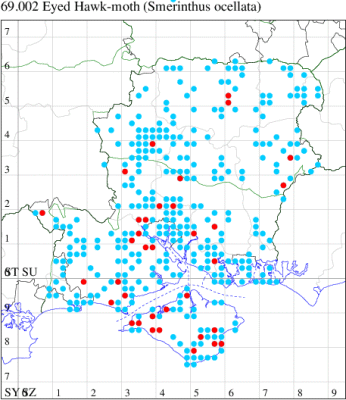 Common in gardens, orchards, parks, fens, scrub and woodland throughout England and Wales. Widespread and fairly common in Hampshire and on the Isle of Wight. Wingspan 75-95 mm. Larva feeds on most species of Salix and Malus, over-wintering as a pupa.
