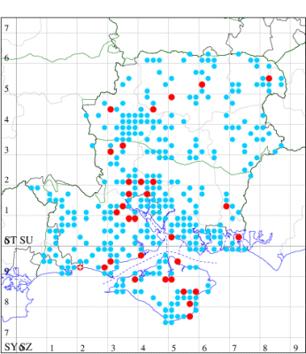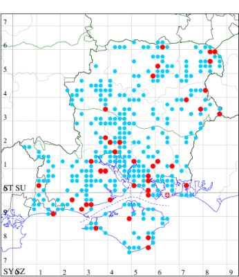 For the maps, all records prior to 2022 are shown by a blue dot (the larger the dot, the more recent), with the current year's records shown in red. As previous records are superimposed on any report for 2022, new sites have greater emphasis (i.e. will show as 'more red').