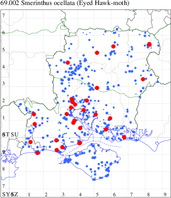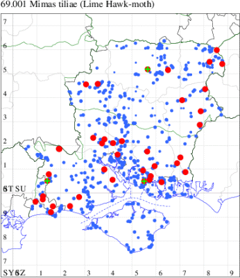 Common in broad-leaved woodland, parks and gardens throughout much of southern England, north to Yorkshire. In Hampshire and on the Isle of Wight fairly common, especially in suburban areas, where the moth is sometimes seen newly emerged on lime trunks, and where the pupa can sometimes be dug from under lime and elm trees. Wingspan 70-80 mm. Unmistakable. Larva feeds on Lime, English Elm, Birch and Alder, over-wintering as a pupa.