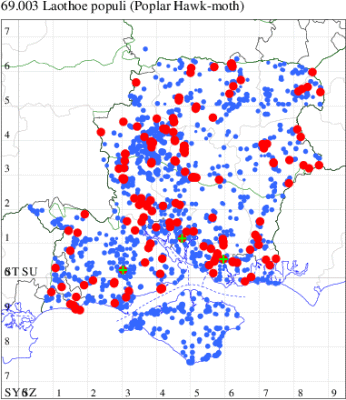 For the maps, all records prior to 2023 are shown by a blue dot (the larger the dot, the more recent), with the current year's records shown in red. As previous records are superimposed on any report for 2023, new sites have greater emphasis (i.e. will show as 'more red').