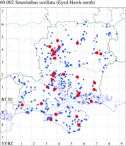 Common in parkland, gardens, fens, woodland, heathland and moorland throughout the British Isles. Widespread and common in Hampshire and on the Isle of Wight. Wingspan 72-92 mm. Unmistakable. Larva feeds on Aspen, White Poplar, Black Poplar, Goat Willow and Grey Willow, over-wintering as a pupa.