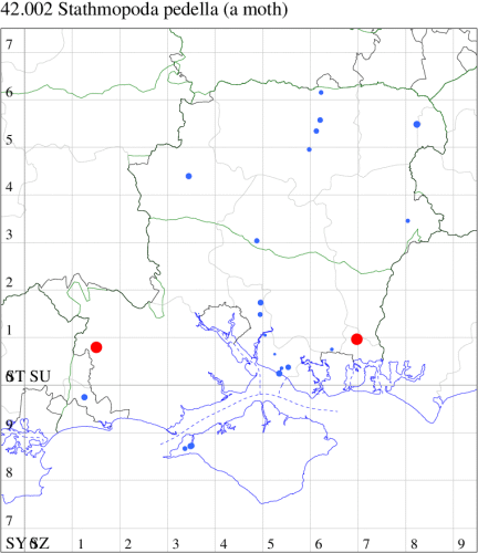 Nationally scarce (Nb) in damp woodland throughout south-eastern England, north to Yorkshire. In Hampshire, it has a patchy and erratic performance, although relatively frequent in Hedge End. First recorded on the Isle of Wight at Freshwater in 2011. Wingspan 10-14 mm. Unmistakable, with remarkable resting posture in which hind legs point upwards, a resting posture shared only by the otherwise dissimilar Schreckensteinia festaliella. Larva feeds on catkins, buds and leaves of Alder and Grey Alder, over-wintering as a pupa.