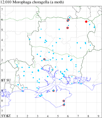 For the maps, all records prior to 2020 are shown by a blue dot (the larger the dot, the more recent), with the current year's records shown in red. As previous records are superimposed on any report for 2020, new sites have greater emphasis (i.e. will show as 'more red').