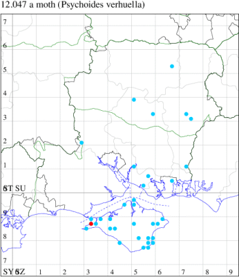 Local in parts of southern England and Wales, mainly on the coast, perhaps originating from ferns imported from the far east and spreading through the trade in ferns. In southern Hampshire and on the Isle of Wight, usually confined to the coast, and very rare inland. Wingspan 10-12 mm. Resembles P. verhuella