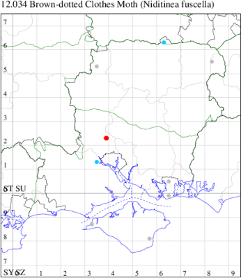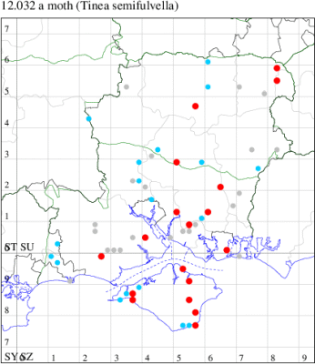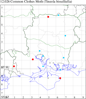 Local in houses and farm buildings throughout the British Isles. In Hampshire and on the Isle of Wight formerly the most abundant clothes moth, but now outnumbered by Case-bearing Clothes Moth Tinea pellionella. Wingspan 9-16 mm. Characterised by reddish ochreous head and pale buff, unmarked forewings. Larva feeds on woollen materials, animal fur, feathers in bird nests and insect collections, living within a silken tube or tent, causing sufficient damage to be a serious pest in some areas.