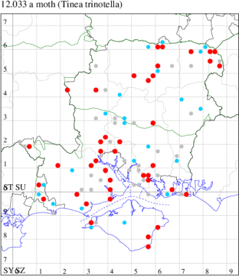 Local in houses, bird nests, barns, warehouses and granaries throughout the British Isles. In Hampshire and on the Isle of Wight sparsely distributed but widespread. Wingspan 9-16 mm. Probably the commonest tineid clothes moth, but cannot always be reliably separated from T. translucens or T. dubiella without dissection of the genitalia. Larva feeds on woollen materials, fur, feathers, hair, owl pellets and stored goods, living within a silken case, causing sufficient damage to be a serious pest in some areas.