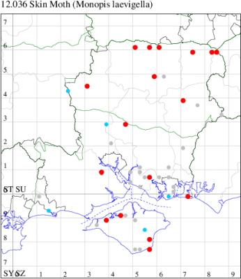 Common in a wide range of habitats throughout Britain, more numerous in the north. Scattered records from Hampshire and the Isle of Wight. Wingspan 13-18 mm. Very similar to Skin Moth M. laevigella, and some of the criteria quoted for the separation of the two species are of limited use when confronted with a single specimen in isolation. Larva feeds on dead animals and animal waste, often in bird nests.
