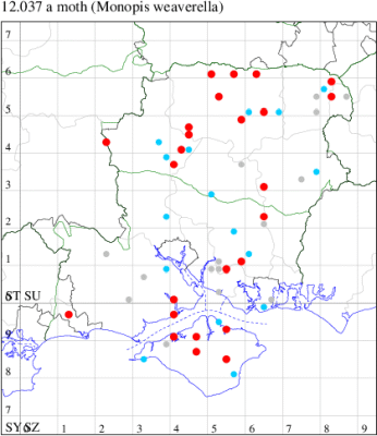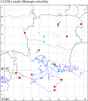 VC11: Romsey, one, 17 Jun (NRJ); Needs Ore NNR, two, 09 Jul (CNB); Fareham, one, 21 Jul (MLO); Hurn, one, 15 Oct (MJef); Hengistbury Head, one, 08 Aug (RPH det. MJef); Pennington, one, 11 Aug; 21, indoors, 26 Aug (RFC);