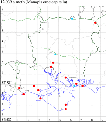 Local in barns, warehouses and granaries throughout much of southern Britain, with records north to southern Scotland. In Hampshire and on the Isle of Wight widespread and reasonably common in the south of the county. Wingspan 10-13 mm. Similar to M. crocicapitella, which see for differences. Larva feeds on woollen materials and refuse, and detritus in bird nests.