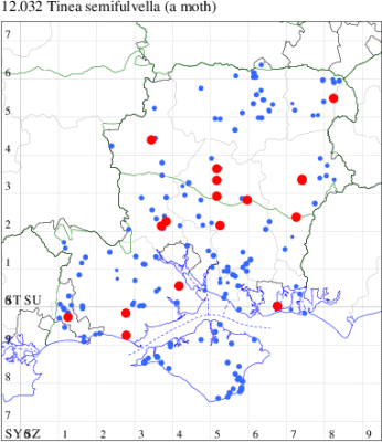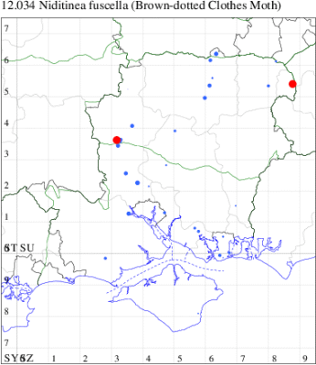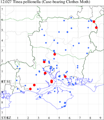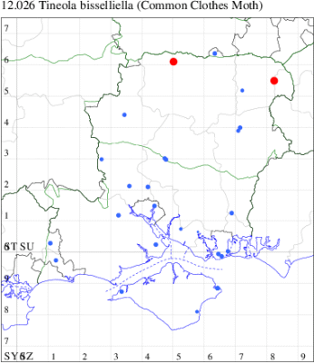 Local in houses and farm buildings throughout the British Isles. In Hampshire and on the Isle of Wight formerly the most abundant clothes moth, but now outnumbered by Case-bearing Clothes Moth Tinea pellionella. Wingspan 9-16 mm. Characterised by reddish ochreous head and pale buff, unmarked forewings. Larva feeds on woollen materials, animal fur, feathers in bird nests and insect collections, living within a silken tube or tent, causing sufficient damage to be a serious pest in some areas.