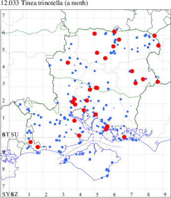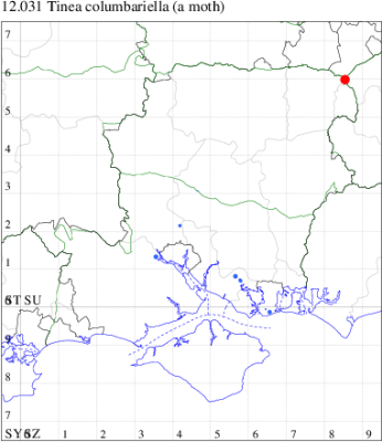 Local in houses, bird nests, barns, warehouses and granaries throughout the British Isles. In Hampshire and on the Isle of Wight sparsely distributed but widespread. Wingspan 9-16 mm. Probably the commonest tineid clothes moth, but cannot always be reliably separated from T. translucens or T. dubiella without dissection of the genitalia. Larva feeds on woollen materials, fur, feathers, hair, owl pellets and stored goods, living within a silken case, causing sufficient damage to be a serious pest in some areas.